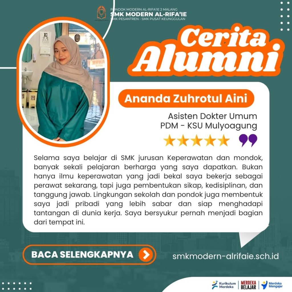 Testimoni selama di SMK/ pondok: Selama saya belajar di SMK jurusan Keperawatan dan mondok, banyak sekali pelajaran berharga yang saya dapatkan. Bukan hanya ilmu keperawatan yang jadi bekal saya bekerja sebagai perawat sekarang, tapi juga pembentukan sikap, kedisiplinan, dan tanggung jawab. Lingkungan sekolah dan pondok juga membentuk saya jadi pribadi yang lebih sabar dan siap menghadapi tantangan di dunia kerja. Saya bersyukur pernah menjadi bagian dari tempat ini.