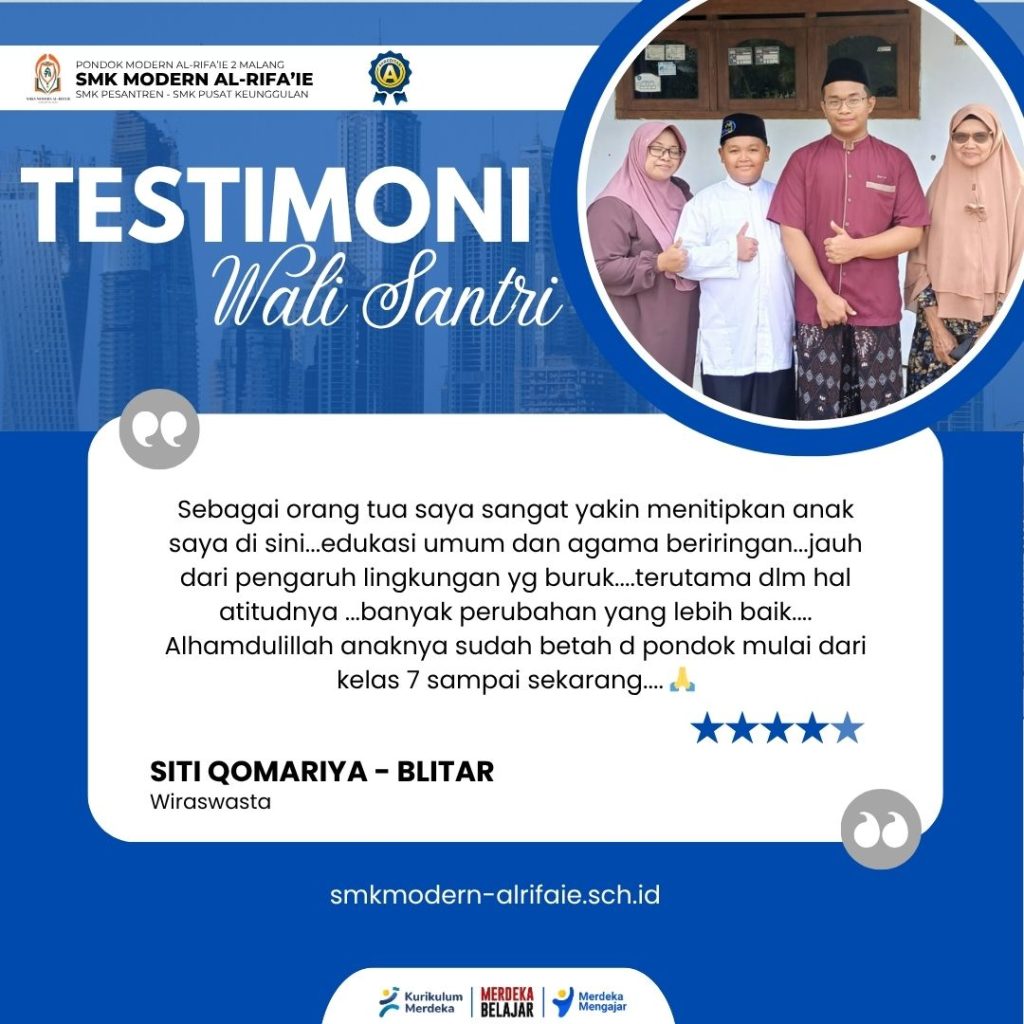 Melihat anak saya betah di pondok sejak kelas 7 hingga sekarang adalah kebahagiaan tersendiri bagi kami. Ini membuktikan bahwa pondok ini adalah tempat yang nyaman, aman, dan kondusif untuk tumbuh kembangnya. Terima kasih atas bimbingan dan pengasuhan yang luar biasa.”